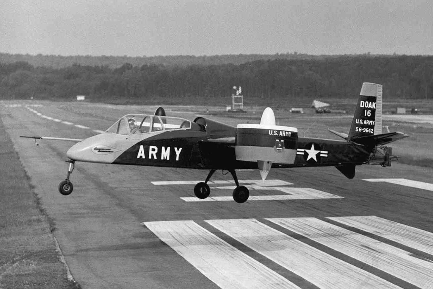 Doak’s engineers believed that they could solve the prototype’s problems. After taxi testing, 32 hours of flight testing in a test stand, and 18 hours of tethered hovering, the aircraft was transferred to Edwards Air Force Base, California, in October 1958. It underwent another 50 hours of testing in which it proved capable as the pitching moment was reduced by half and with the upgraded T-53 turboshaft engine with 1,000 (SHP) achieving a maximum speed of 230 mph and a cruise speed of 175 mph.
